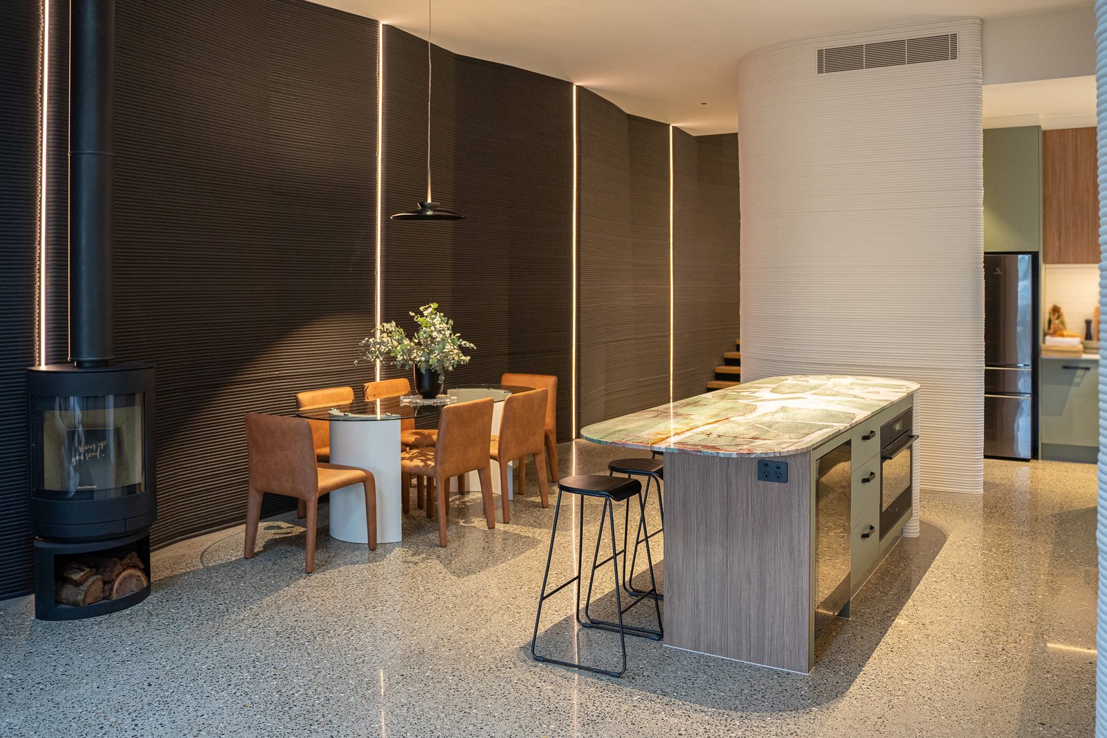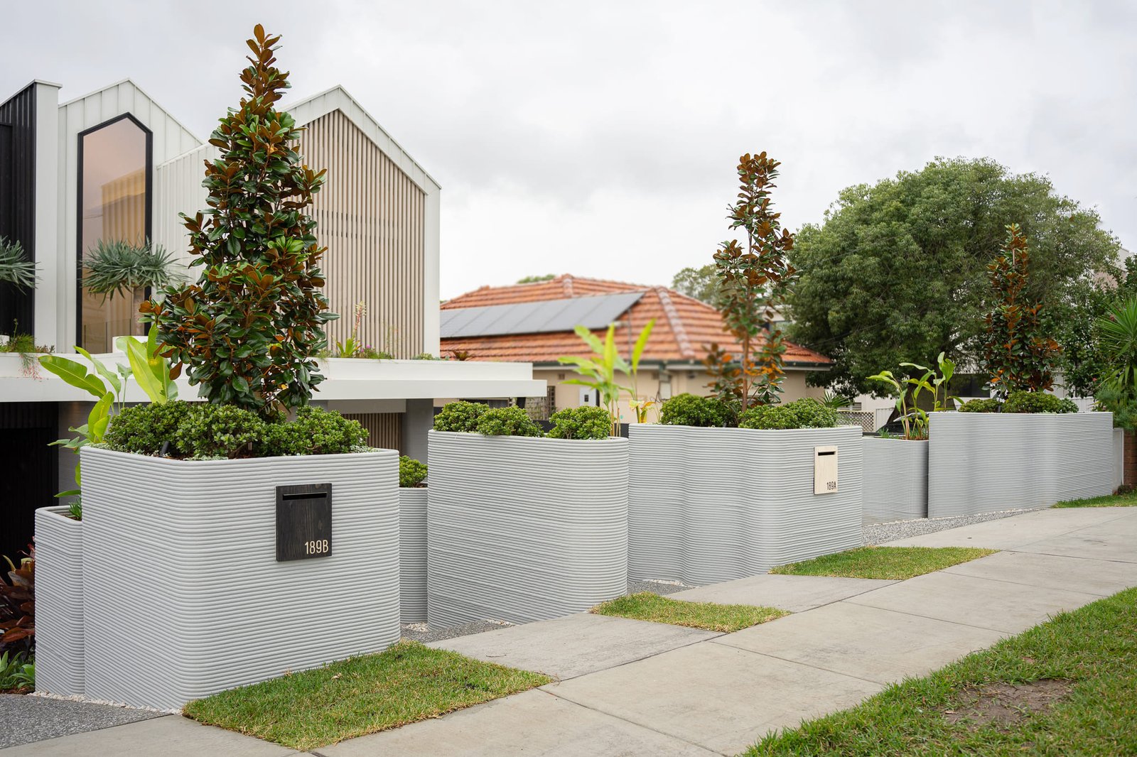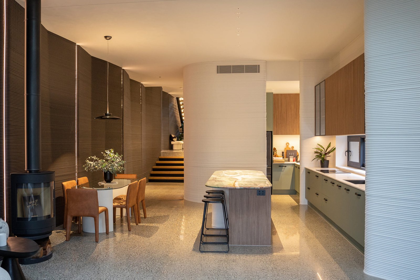 The completed Kingsway residence stands out as a piece of contemporary architecture that blends innovation with liveability. The 3D‑printed forms provide a textural, sculptural façade, while timber screens and abundant planting soften the aesthetic and tie the home to its suburban streetscape. Inside, the open‑plan kitchen and dining areas flow into private courtyards, creating flexible entertaining spaces. This project highlights Monumental Building Group’s ability to deliver complex, technology‑driven builds without compromising on craftsmanship or comfort.