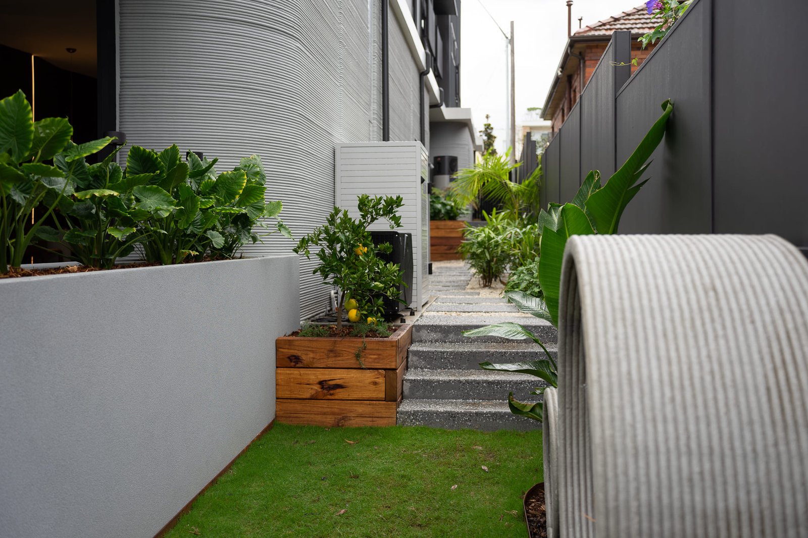 Contour 3D – The Kingsway is a striking urban residence that showcases Monumental Building Group’s embrace of cutting‑edge construction. The façade pairs 3D‑printed concrete walls with vertical timber screens and lush planters, creating a sculptural street presence. Inside, curved partitions, terrazzo flooring, and warm timber joinery deliver a sophisticated yet welcoming environment.