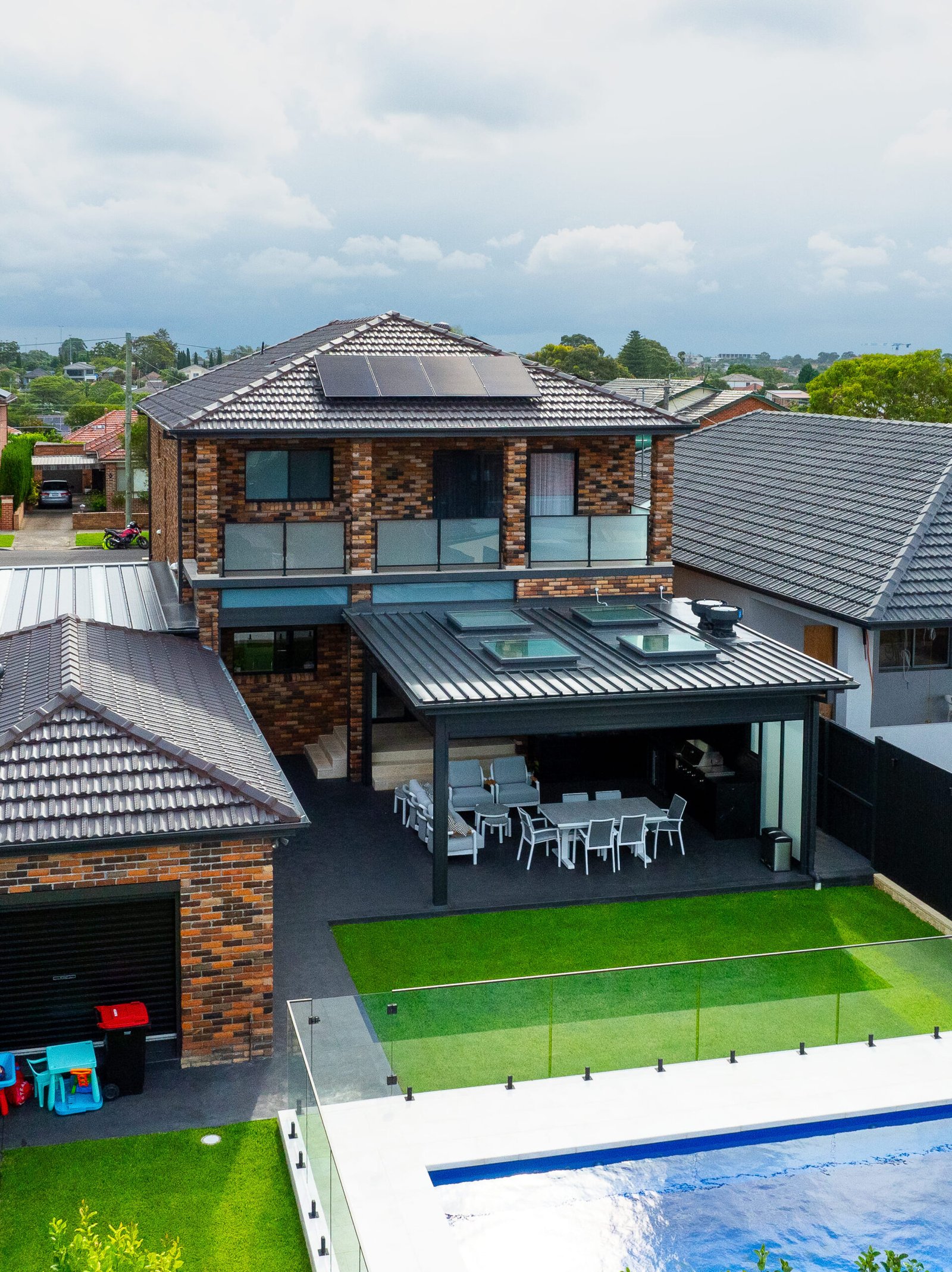 The Kingsgrove project transformed an ordinary suburban property into a stylish retreat. The new alfresco pavilion extends the living space outdoors, providing a shaded area for cooking and dining year‑round. The sparkling pool, surrounded by lawn and glass balustrade, adds a resort feel and invites relaxation. The covered carport enhances functionality and matches the home’s architecture, while updated landscaping and privacy screens create a lush, private environment. Through thoughtful design and careful management, Monumental Building Group delivered a cohesive upgrade that improves livability, aesthetic appeal and sustainability.