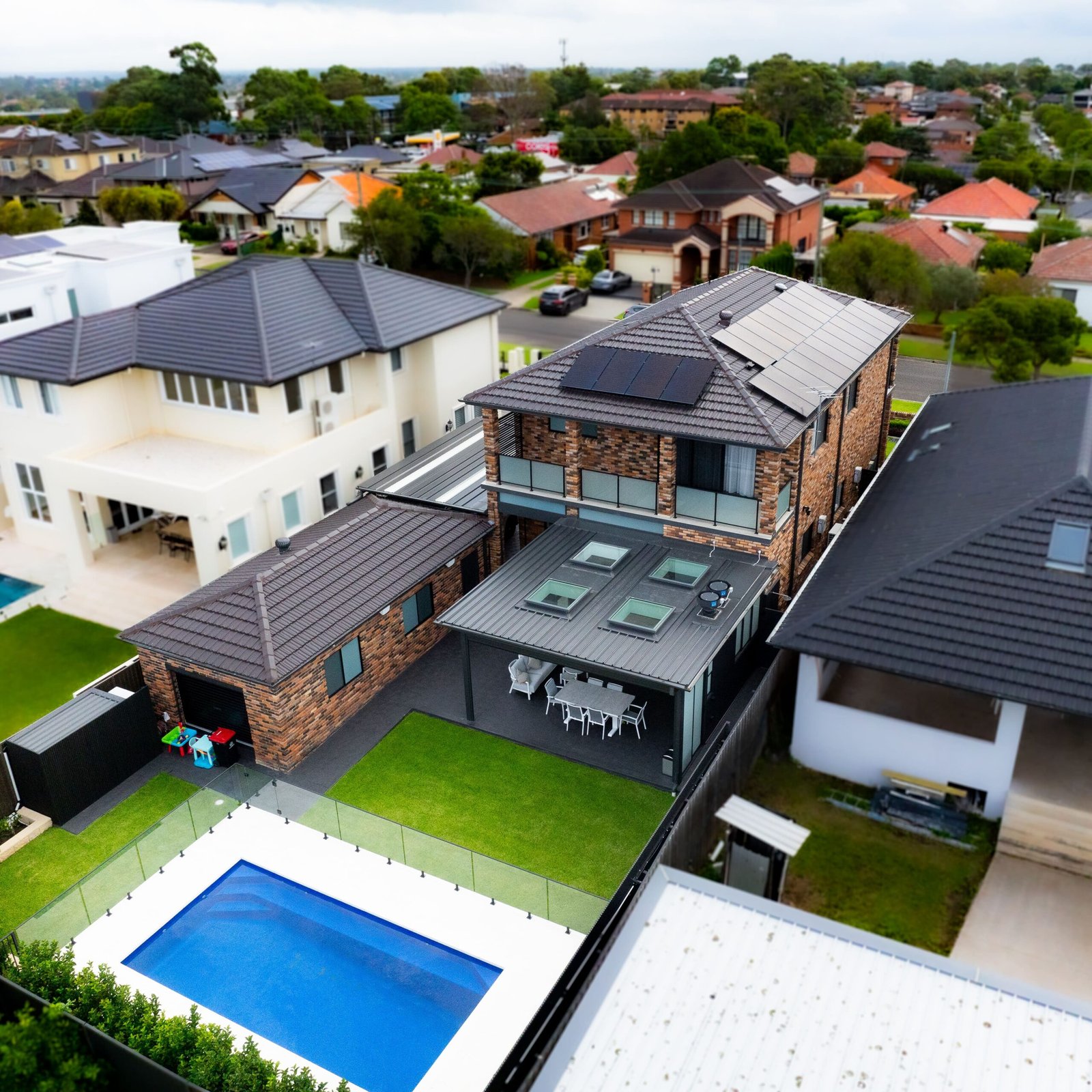 Kingsgrove is a contemporary family residence that Monumental Building Group enhanced with a resort‑style outdoor living area. The project included construction of a covered alfresco pavilion with a louvred roof and built‑in outdoor kitchen, installation of a rectangular in‑ground pool with glass fencing, addition of a carport/covered driveway, and comprehensive landscaping. The resulting home now offers seamless indoor–outdoor flow and improved curb appeal.