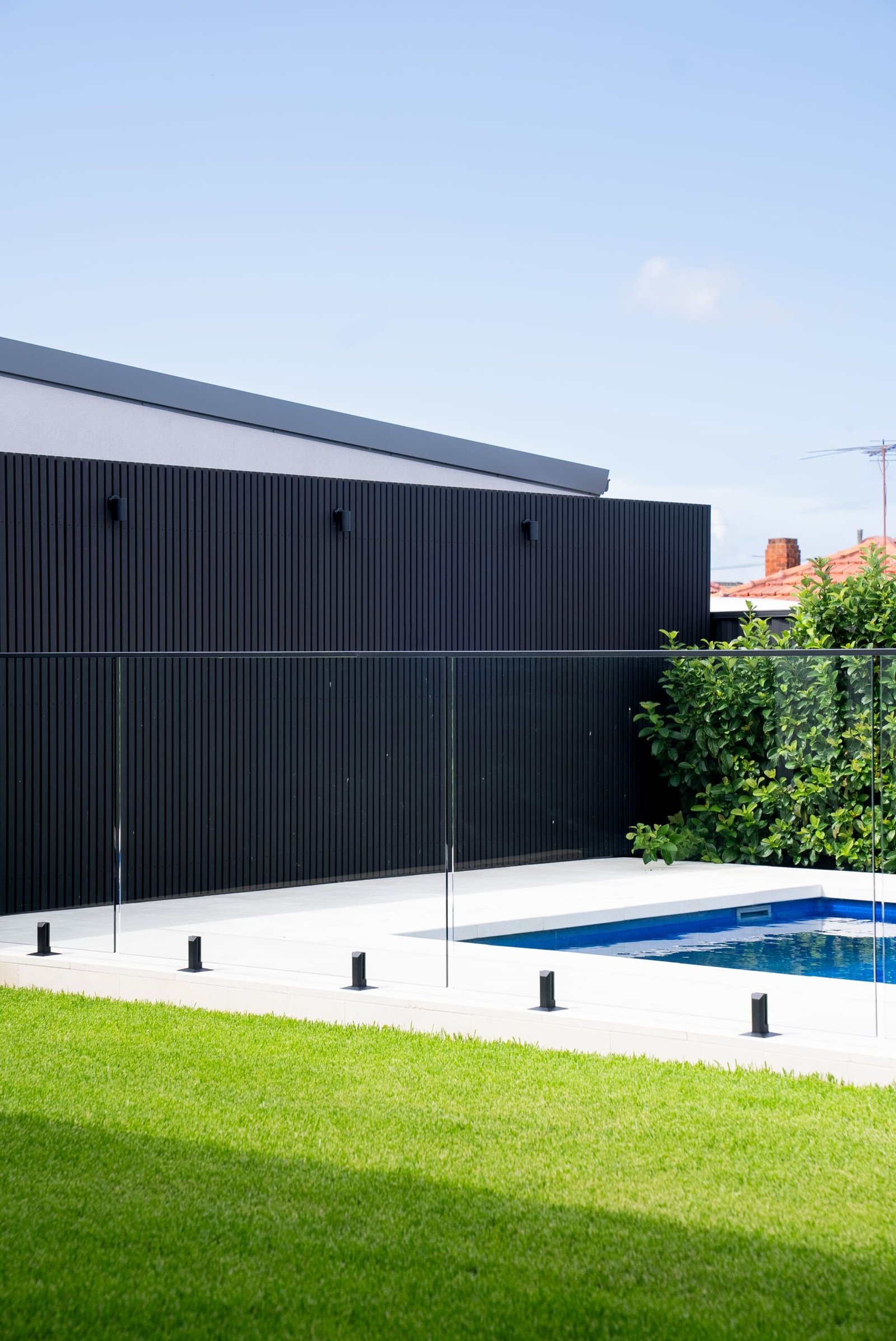 • Swimming pool: Installation of a rectangular in‑ground pool with tiled coping, glass fencing and surrounding lawn.