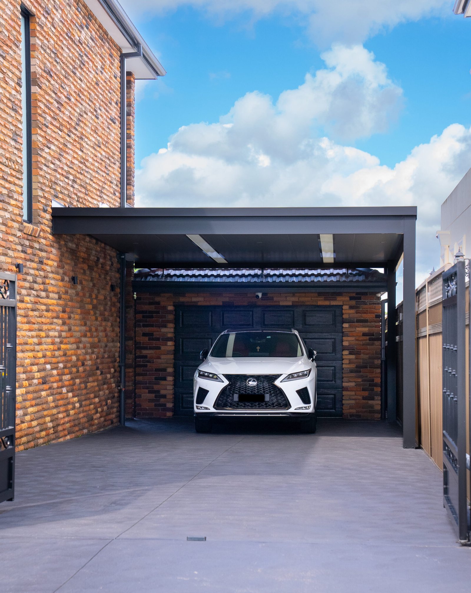 • Carport & driveway: Construction of a covered carport/porte‑cochère with matching roofline and lighting, providing secure off‑street parking.